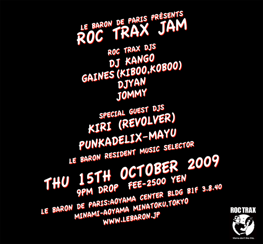 October, 12 2009 Posted by TEAM 2055 ROC TRAX JAM 10月15日 青山 LE BARON にて、やばいPARTY!! 『 Le Baron Presents ROC TRAX JAM 』 DJには、もちろん 55DSL (roc trax) の DJ YAN & DJ JOMMY !! DJ YANDJ JOMMY Category : MUSIC Tweet BACK NEXT