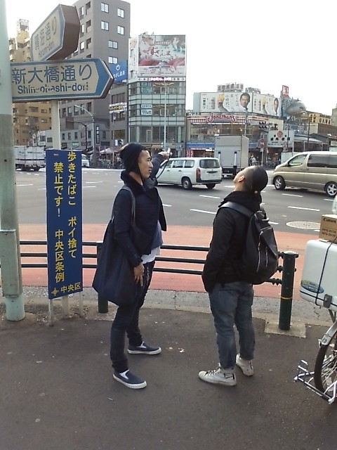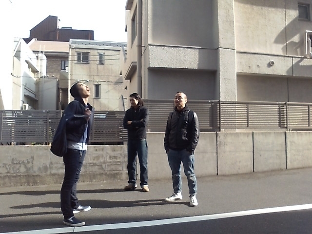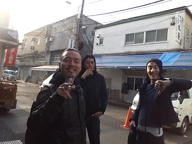 朝10時30分。日の光を浴びる22時間労働を終えた我ら六本木店の3人衆。右から玉袋店長、チビ、そして僕。