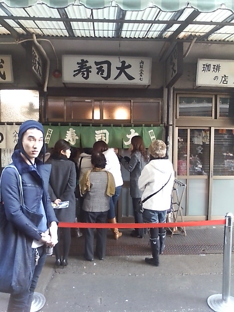 築地No,1と言われている『寿司大』に。この店は朝五時OPENでずっと列が絶えないらしい。この時12時過ぎ。噂を聞きつけた初めての方やら、リピーターの方やらでいつ来ても並んでいます。