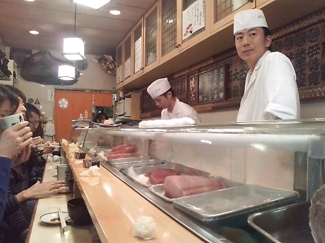 1時間 並んでついに寿司大入店です。威勢のいい職人お出迎え。暖かい。