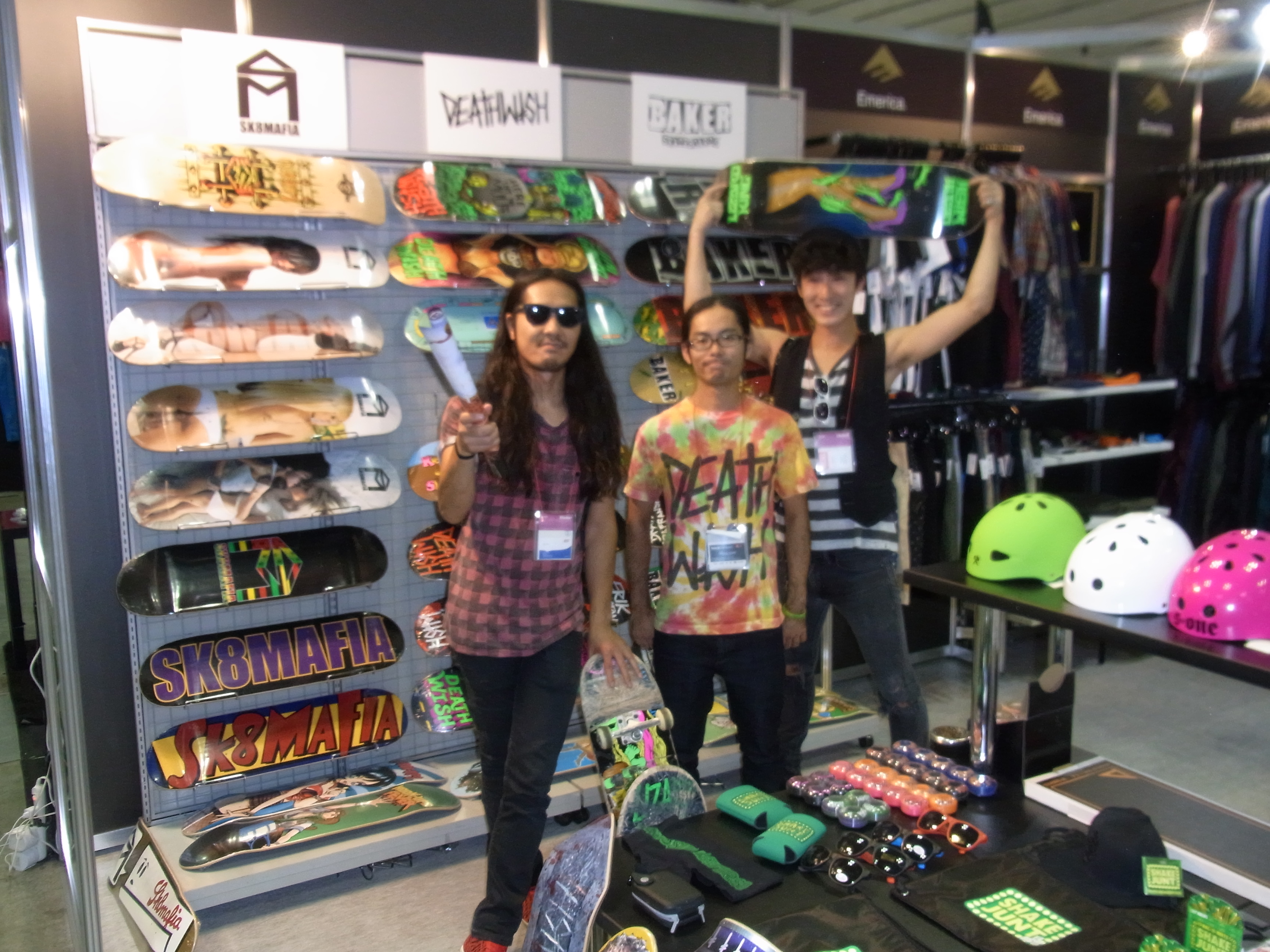 まず焦ってソッコーで向かったのがSonik Distributionのブース!ここには僕らの大好きなDEATH WISH ,SHAKE JUNT ,BAKERなどの展示がしてありまス!こちらの超イカしたTシャツ着ている方は屋慶名さん☆ 僕が最近買ったshoesブランドSUPRAも担当なされてるんですよネ?最近55のお店の方にも遊びに来てくださいました。このblogも見てくれてるみたいでして。ちょっとこっぱずかしいのですが(笑)もう本当このブースにはヨダレが垂れてしまう物がたくさんあります。夢中で中々離れられない僕達でしたがお仕事のお邪魔になってしまうので程々に☆