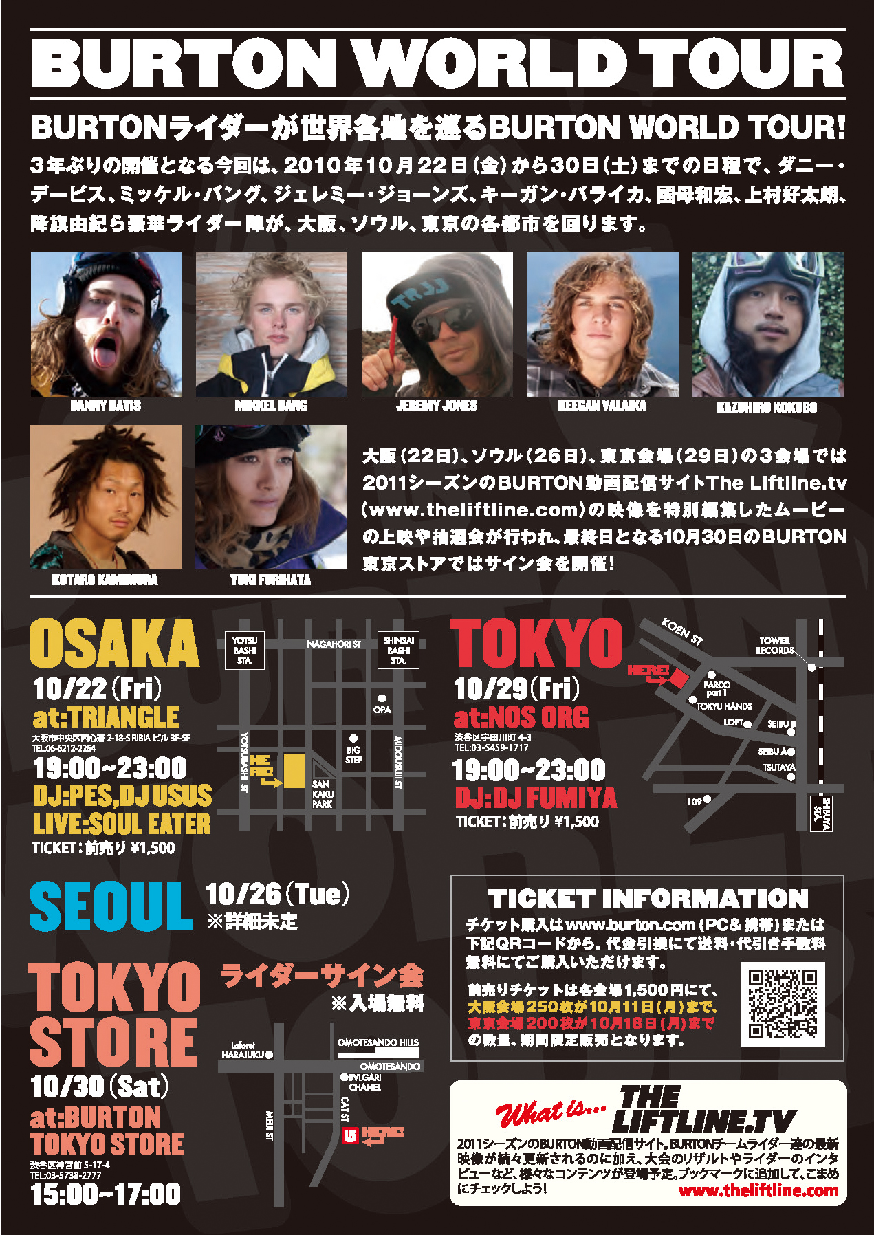 22 日(金)大阪『TRIANGLE』、26 日(火)ソウル、29 日(金)東京『NOS ORG』の 3 会場では、2011 シーズ ンのバートン動画配信サイト『LIFTLINE.TV(www.theliftline.tv)』の映像を特別編集したムービー上映や、抽選会が行われます。そして30 日(土)にはバートン東京ストアでサイン会も開催されるという。是非このバートンチームライダーに触れるチャンスに足を運んでみよう。