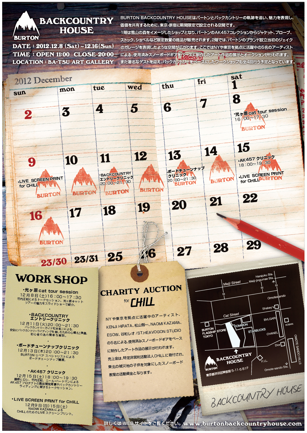 バートンスノーボードは、2012年12月8日(土)から16日(日)の期間、バックカントリーをテーマとした「BURTON BACKCOUNTRY HOUSE」をBATSU ART GALLERYにオープン。